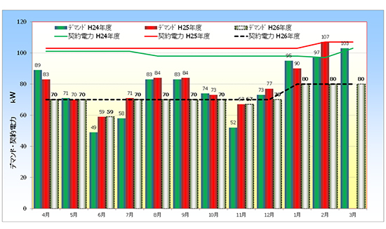 | ●30分間の平均電力 ●デマンドが1回でも契約電力を超過すると当月から1年間契約電力増加→基本料金増加 cf:一般家庭の基本料金:ブレーカ容量(30A、50A etc.)→使用電流がブレーカ容量を超過すると停電 |